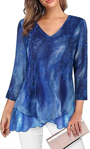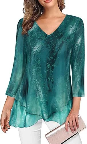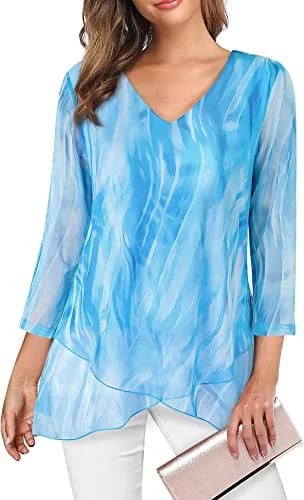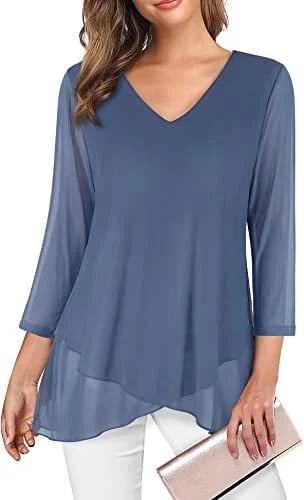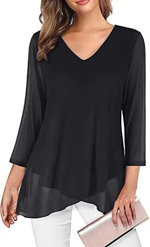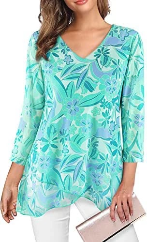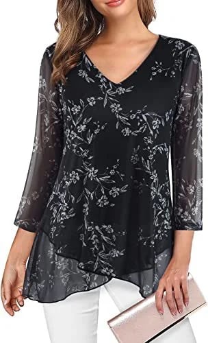 - Unique Design: Women's v neck tunic tops feature a floral outer mesh layer design, light, and flowy double layers design makes you look slimmer and easier for you to get an ultra-chic look. 3/4 ruffle split sleeve shirts could hide little lumps and tummy well and shows more elegance and classiness.
