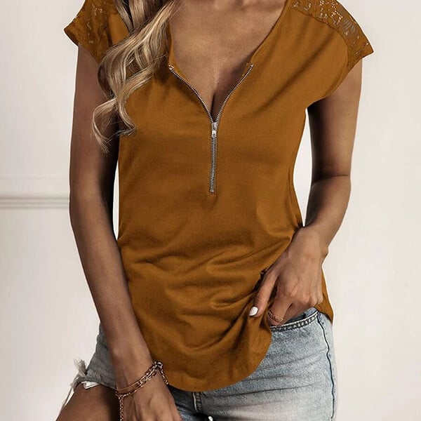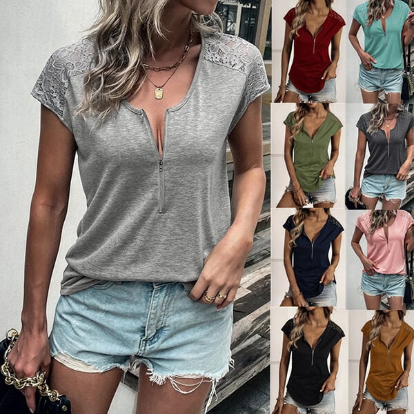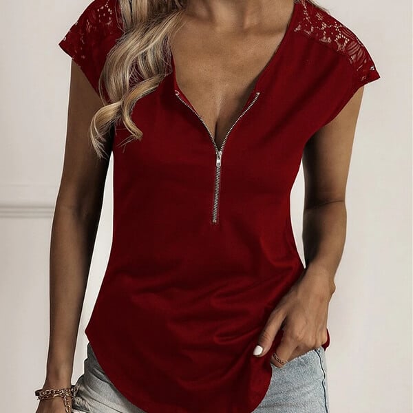 - Package includes: 1 X Round neck half zip panel lace short sleeve t-shirt