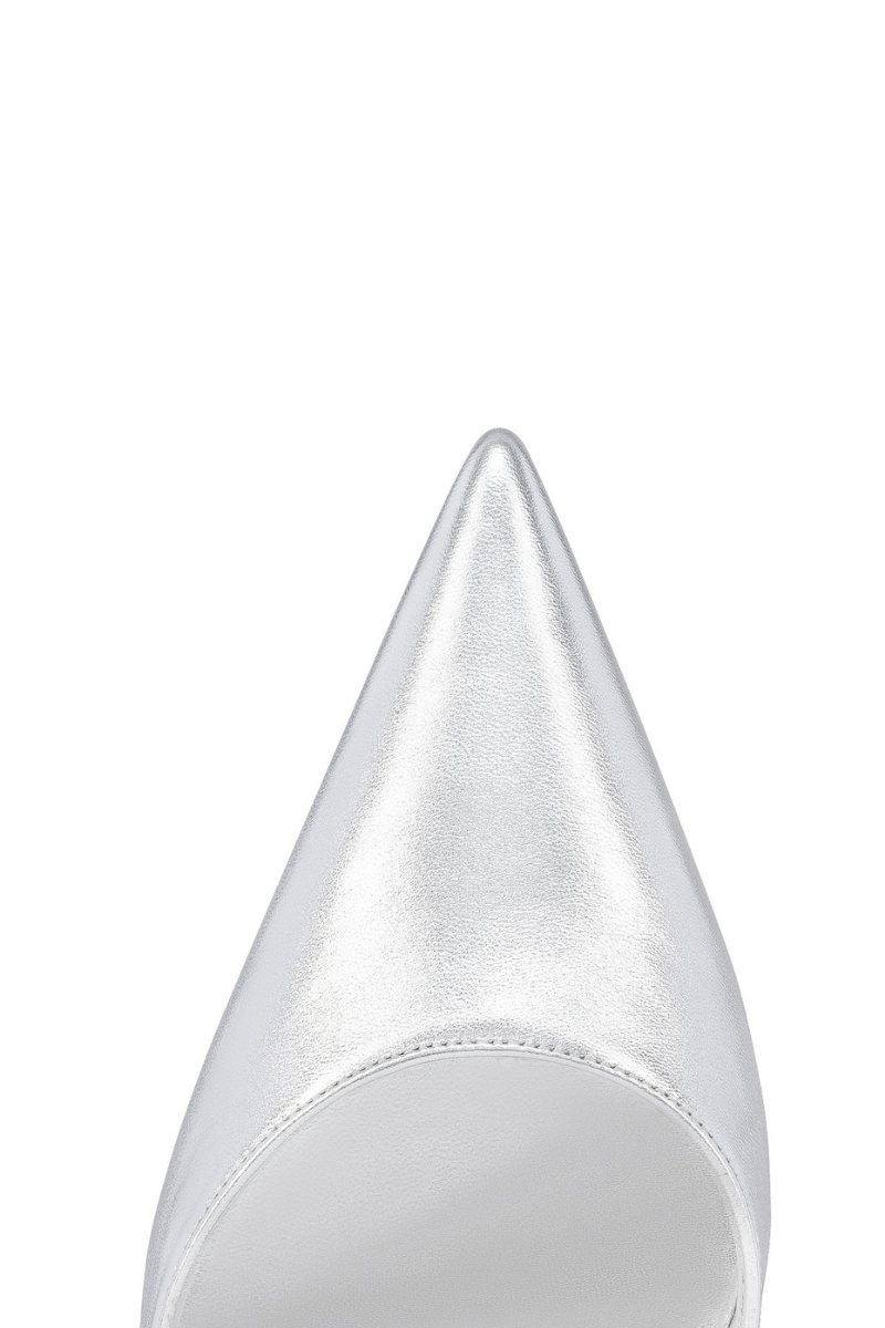 The Apostropha Sling pump has a sophisticated pointed toe. Set on an 80 mm angled heel, this Maison Christian Louboutin model is crafted in silver laminated leather. Its daring low-cut vamp elegantly reveals the foot.