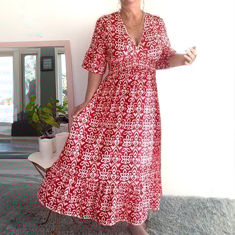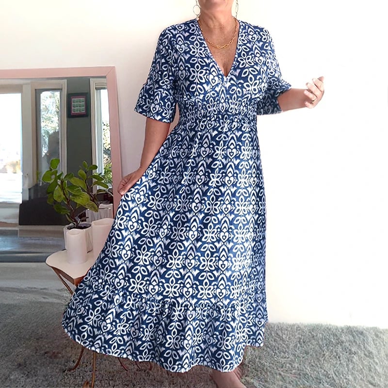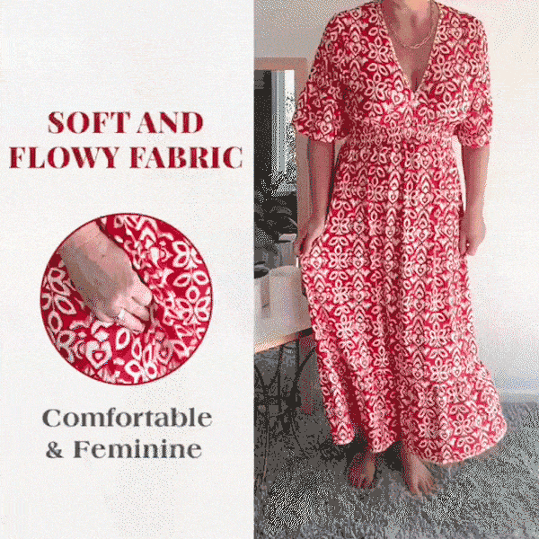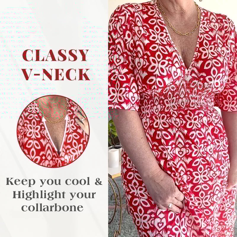 Designed with a V-neckline and a relaxed bust, this dress offers a comfortable and flattering fit. The lightweight fabric adds to its airy feel, making it your go-to choice for breezy days and nights.