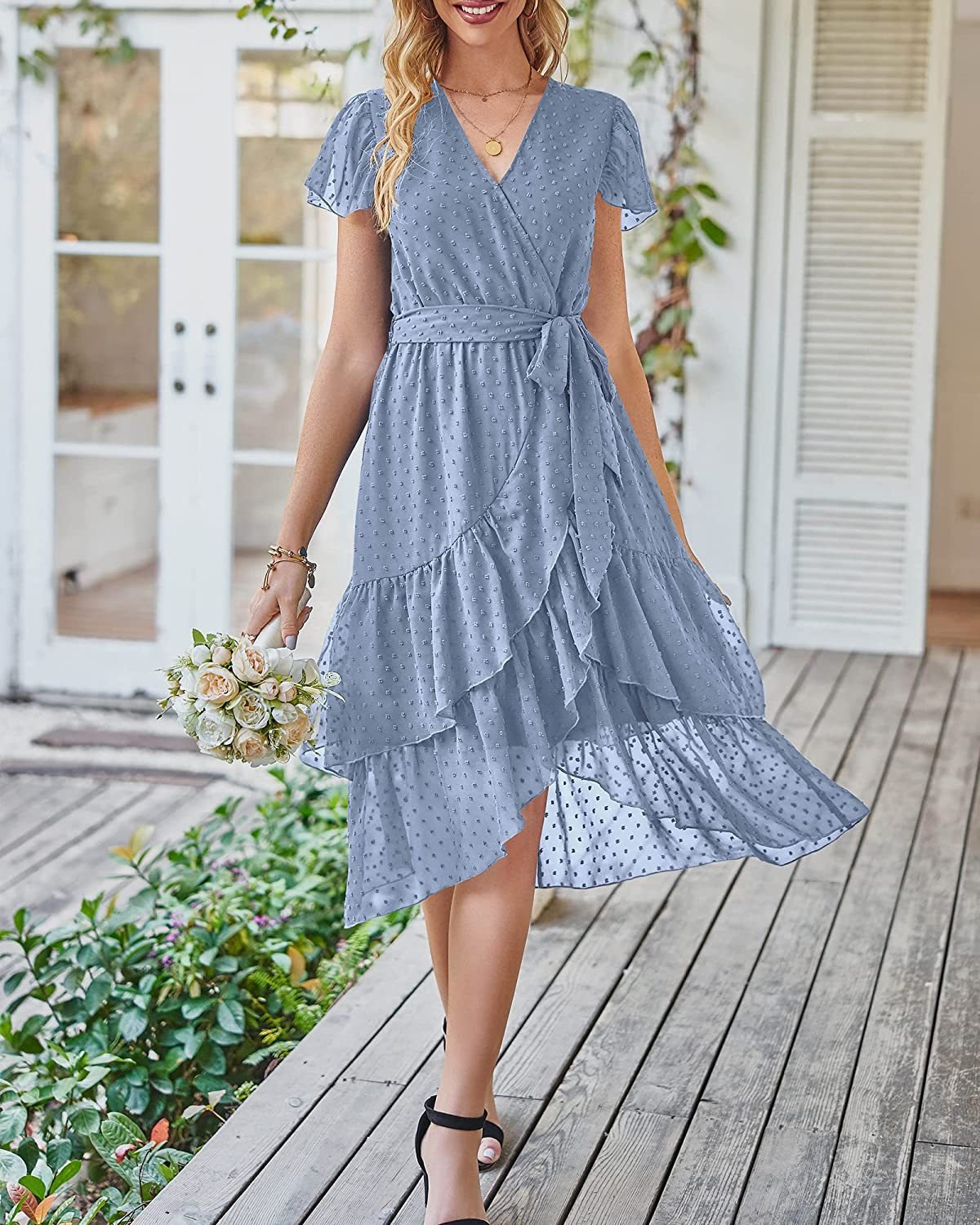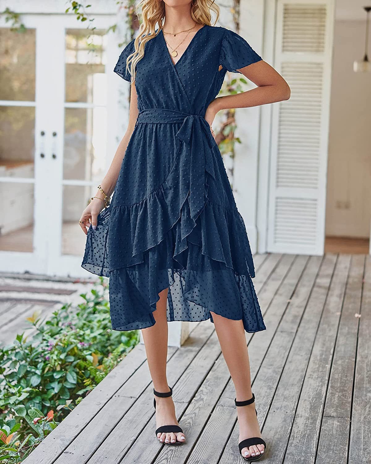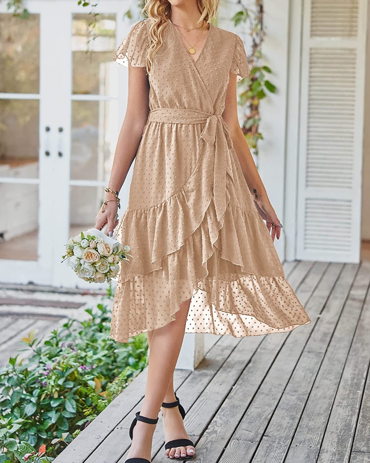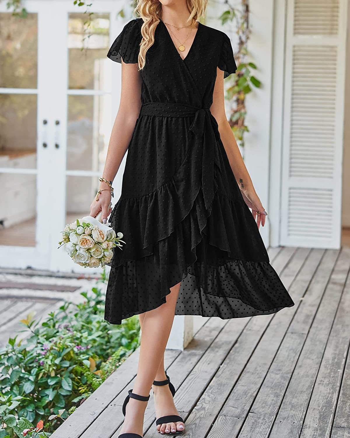 💃The perfect addition to your summer wardrobe, this polka dot tied ruffled chiffon dress is made from a high quality chiffon fabric that is soft and smooth to the touch, while being resistant to wrinkles and shrinkage.
