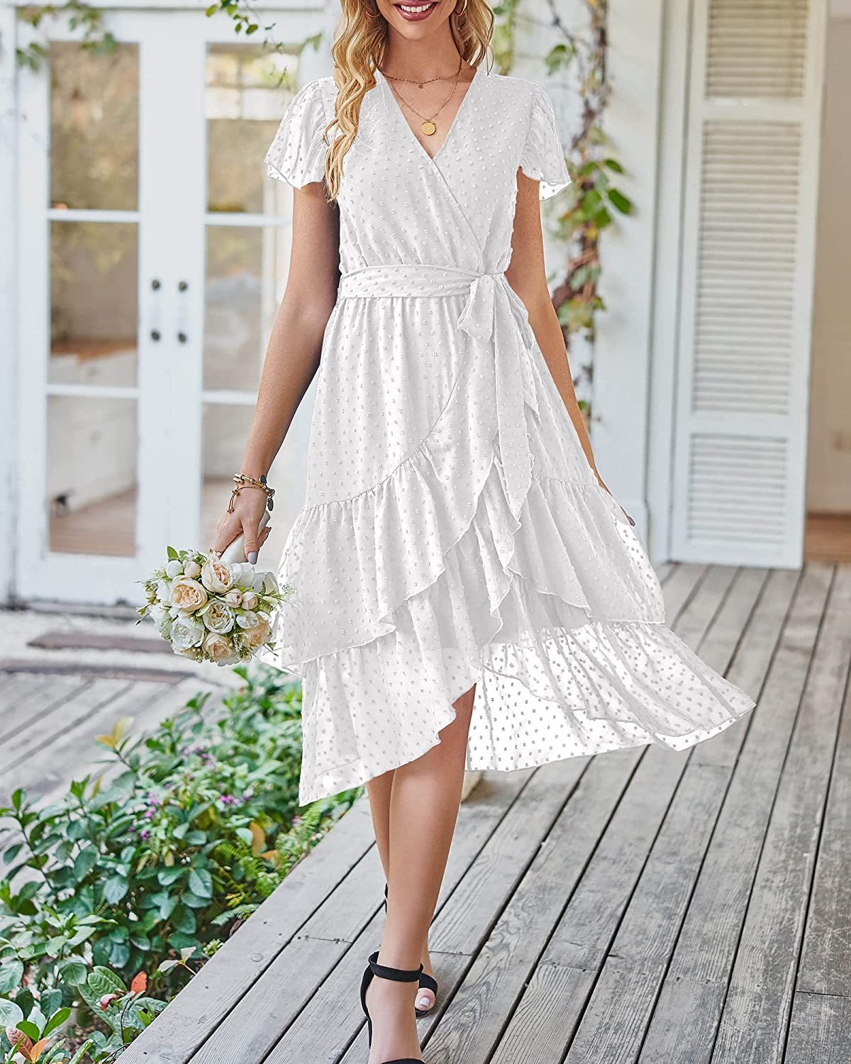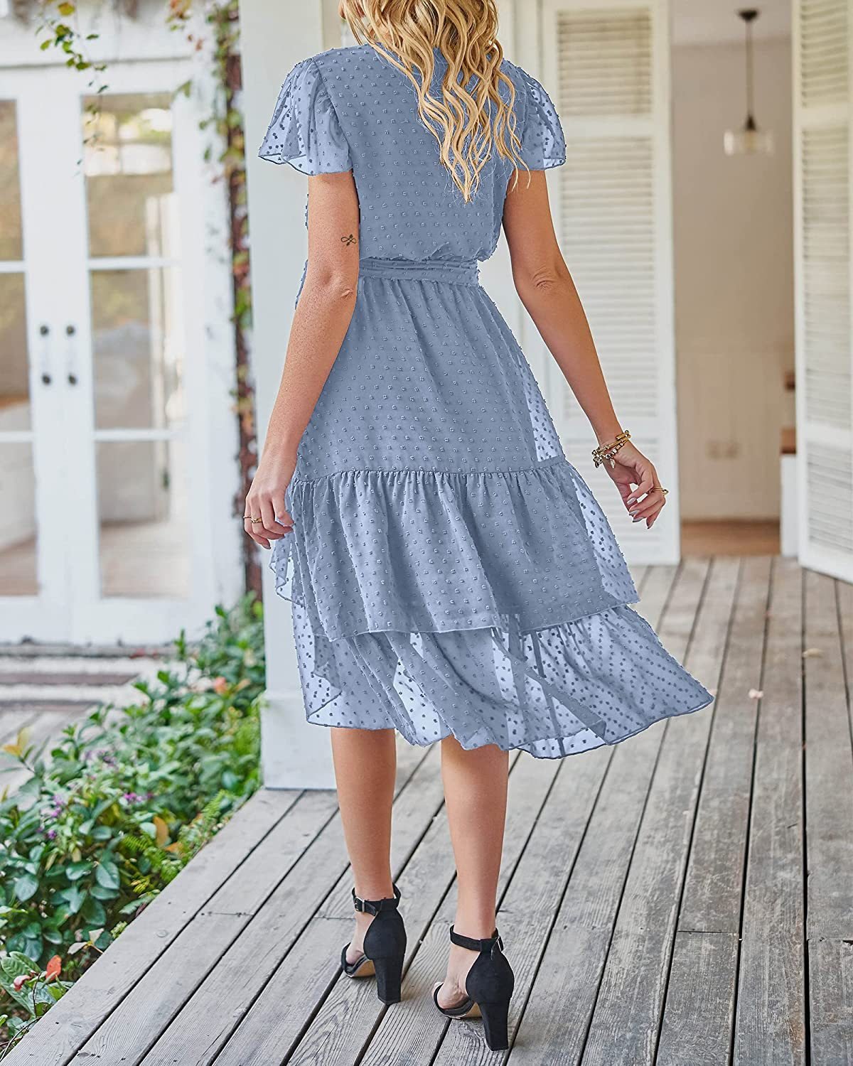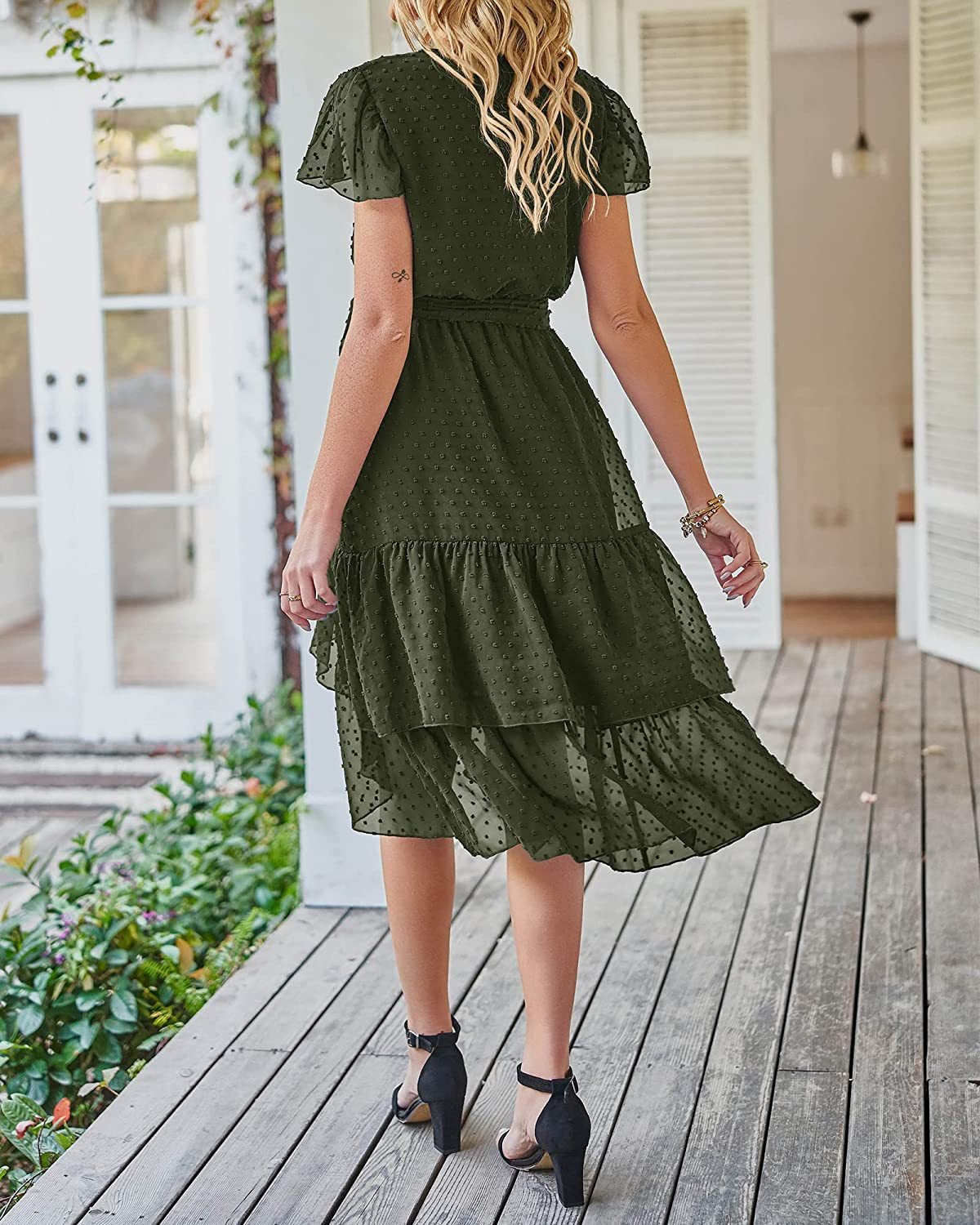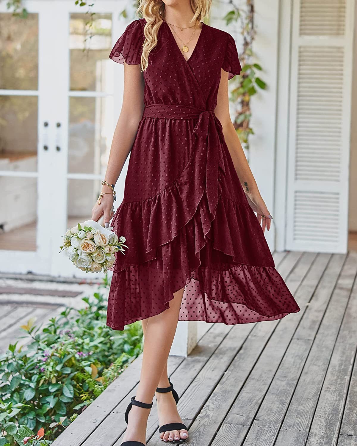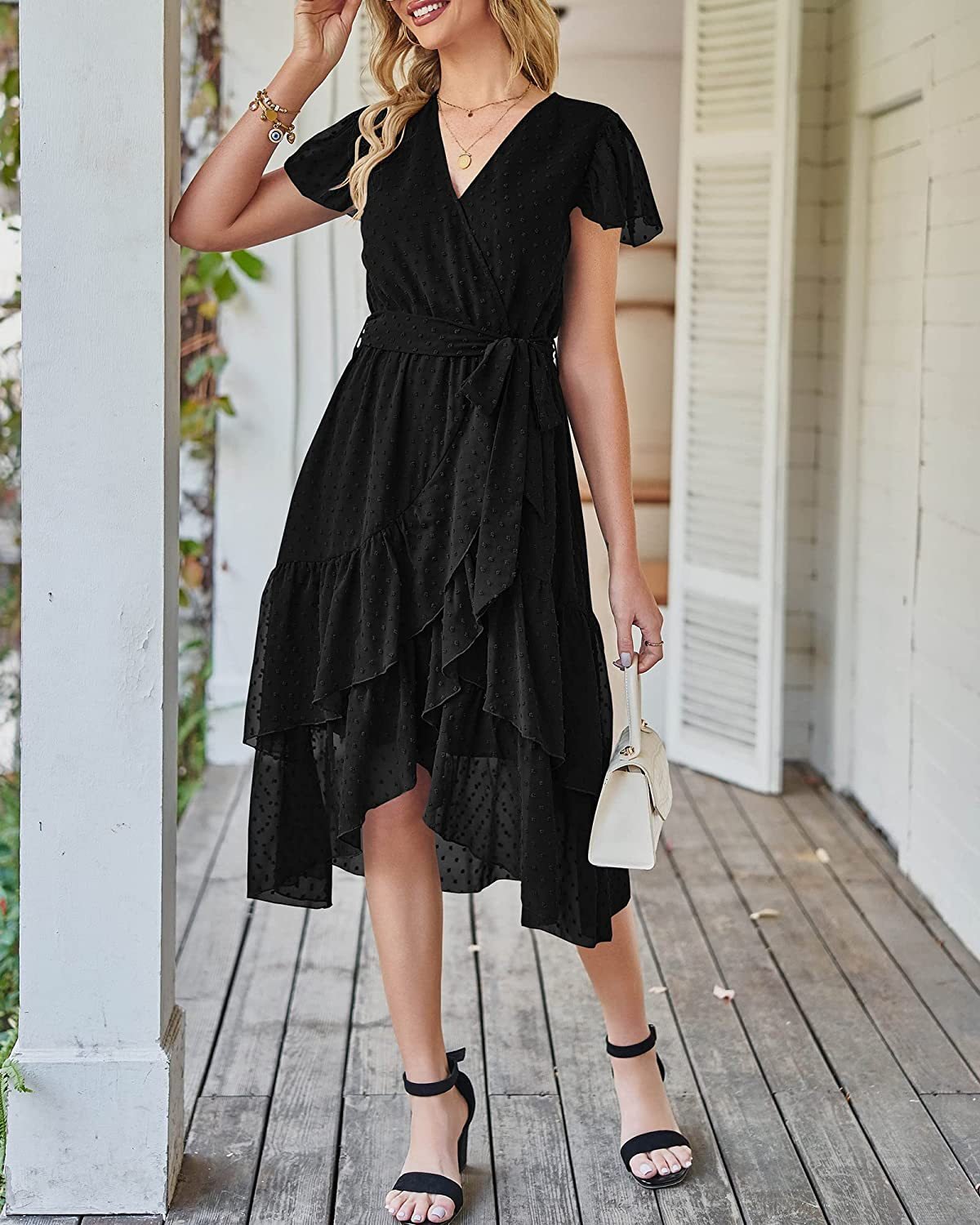 💃The perfect addition to your summer wardrobe, this polka dot tied ruffled chiffon dress is made from a high quality chiffon fabric that is soft and smooth to the touch, while being resistant to wrinkles and shrinkage.