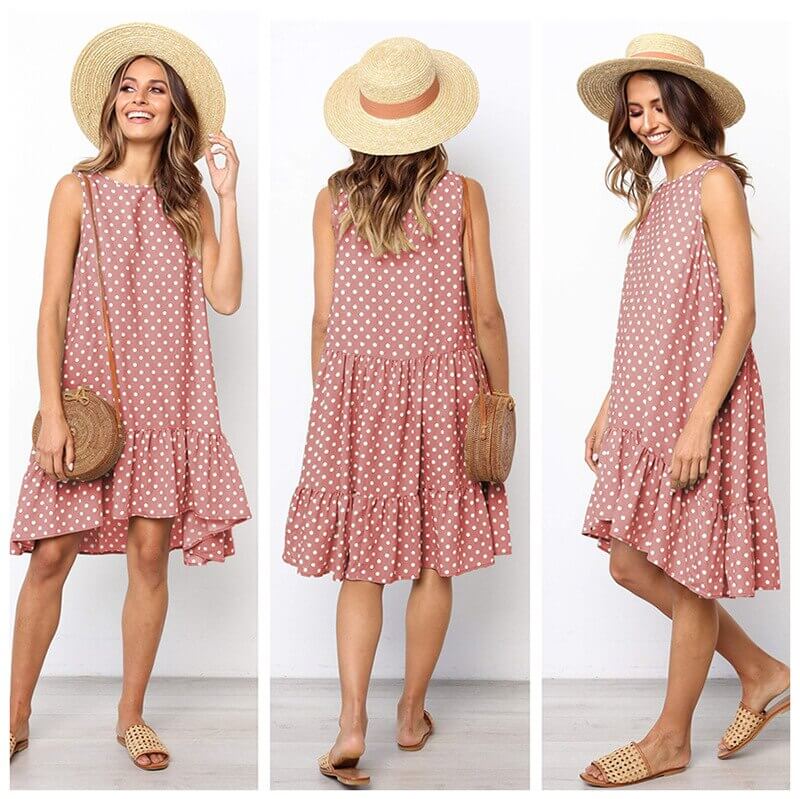 - Adroable polka dots, o-neckline, flattering ruffle hem details, flowy and trendy to hot days.