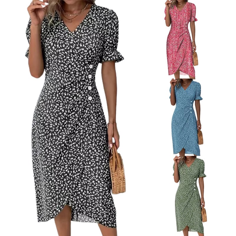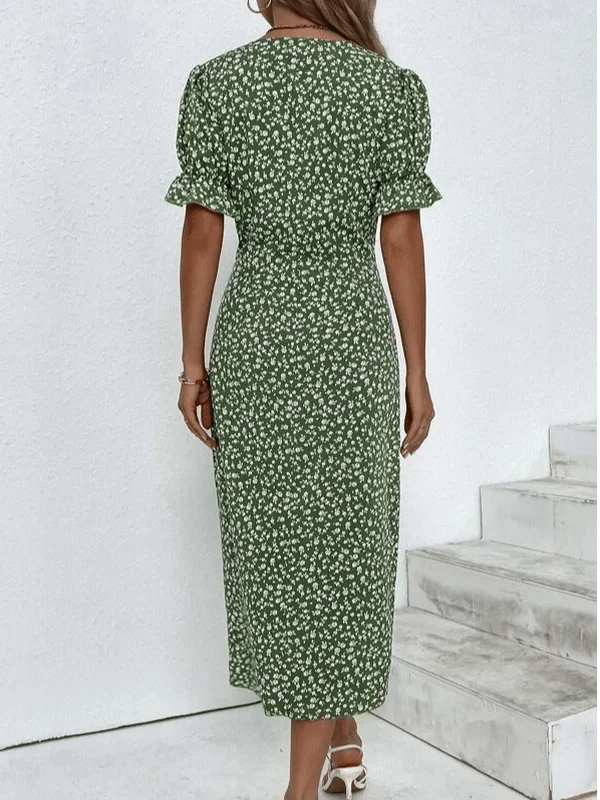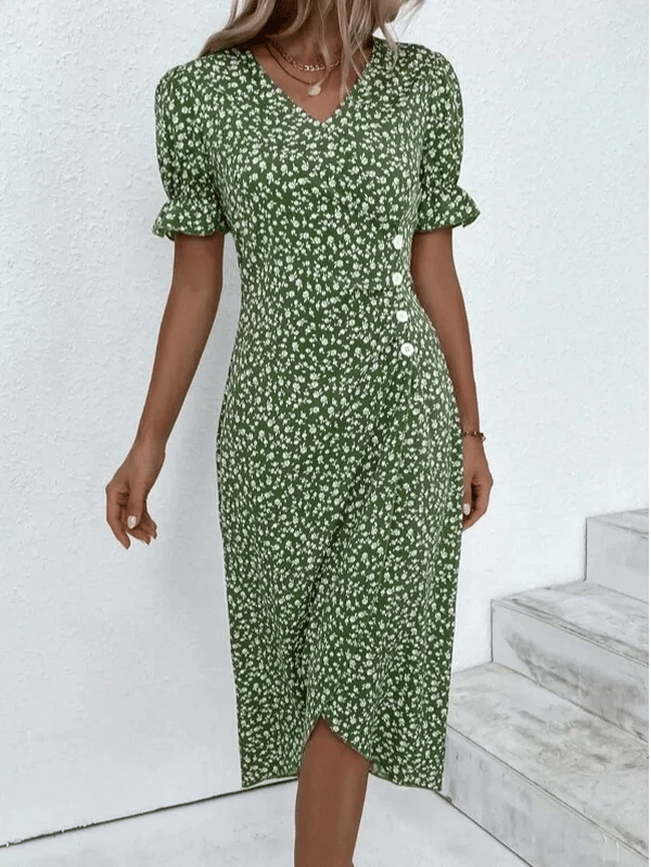 Get ready for summer with this sage green midi dress. Short sleeves with pleats on the front and buttons give it a cinched bodice and detail. The v-neck complements your favorite layering necklaces, accentuated by the mid-calf silhouette with an uneven hem. Finish your look with sandals, heels, or wedges.