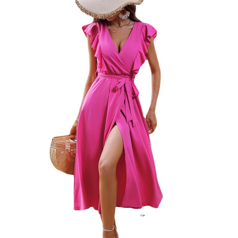 Slit dresses make it easy to walk and accentuate your long legs. The V-neck accentuates your beautiful neckline. The lace-up waistband design not only shows a slim waistline, but also provides you with a comfortable wearing experience.