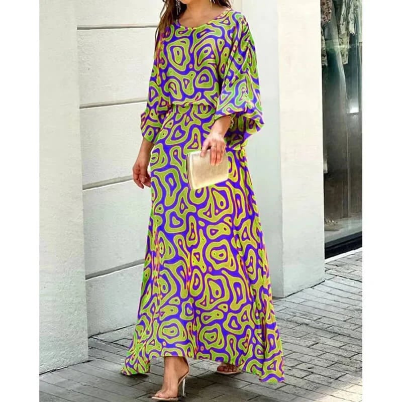 A stunning ensemble that exudes both elegance and glamour. Featuring a gorgeous swirl print that creates a mesmerizing visual effect as you move. The slit sleeves add a touch of drama and a hint of playfulness, while the maxi length brings sophistication and grace.