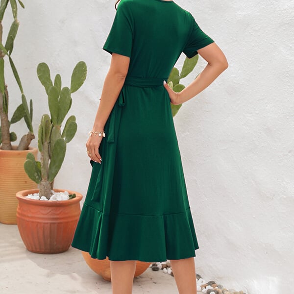 Features: v neck, short sleeve, inside moderate elastic waist, classic a-line and high waist design, asymmetrical ruffle hem, above knee-length, simple solid color with belt.