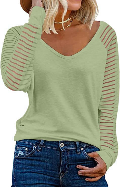 - Womens v neck top, striped on the sheer mesh patchwork long sleeves, raglan sleeve tops, relaxed fit style, cute tops are great for women, ladies or teen girls.